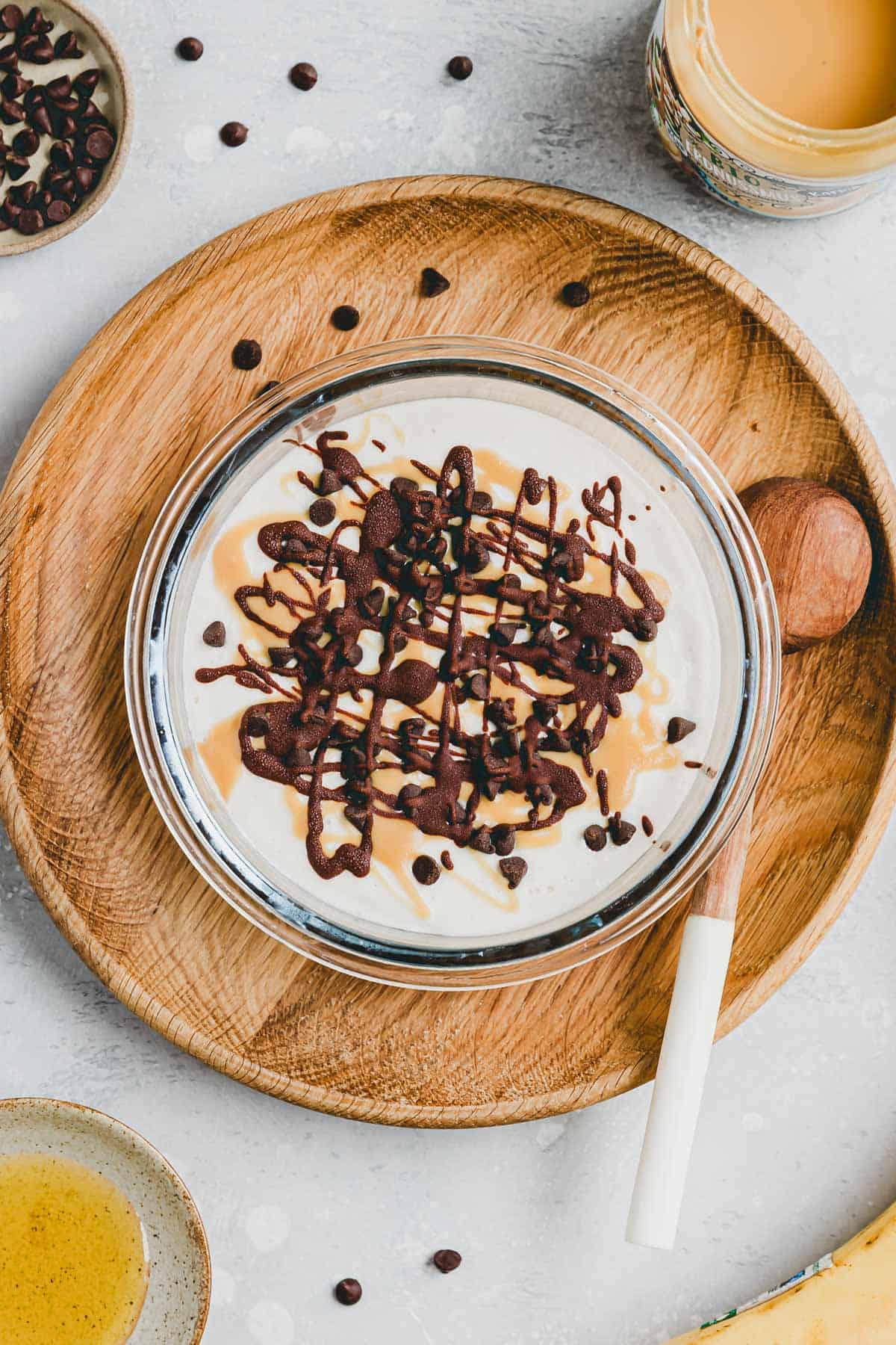 - Texture: Since this recipe doesn’t use an ice cream maker and contains relatively little fat, the texture can be a bit icy. The frozen banana helps counteract that, but it’s still important to let the ice cream sit at room temperature for a while before serving. If you own a Ninja Creami or an ice cream maker – even better! Just prepare the base in it and fold in the toppings afterward for extra creaminess.