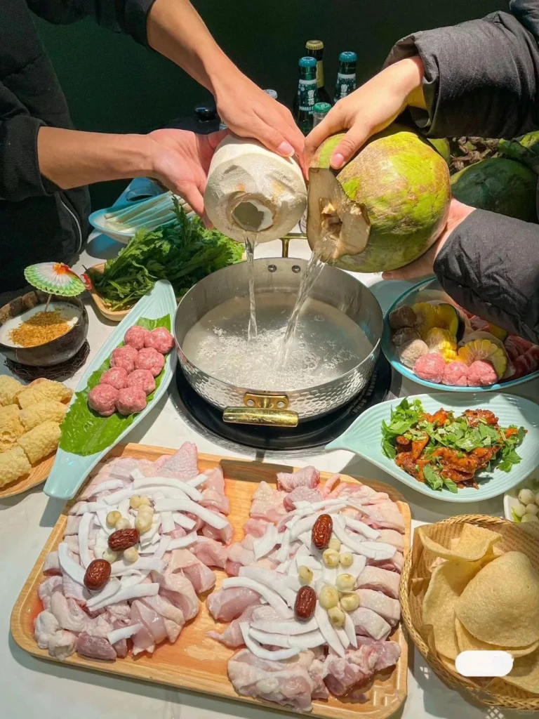 The hotpot also includes various fresh vegetables and mushrooms, such as bamboo fungus and water chestnuts, which absorb the rich coconut flavor.