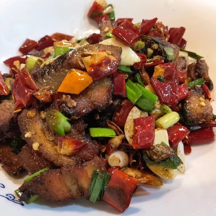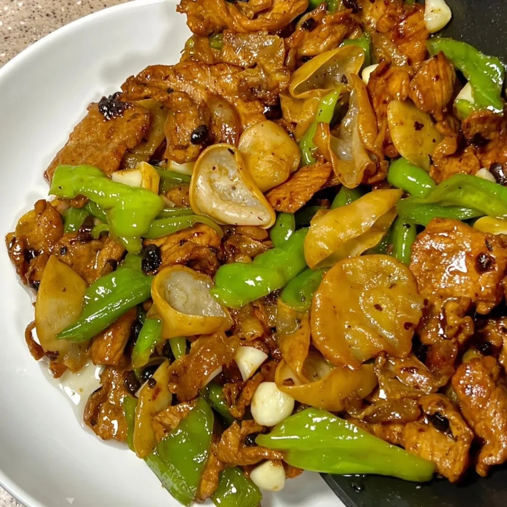 Sliced pork stir-fried with fresh chilies for a spicy and aromatic dish.