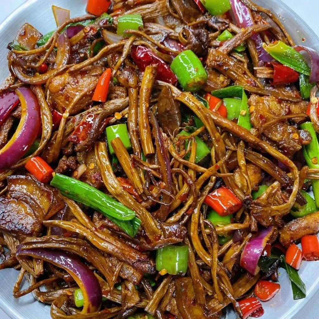Tea tree mushrooms sautéed with cured meat in a flavorful and spicy sauce.