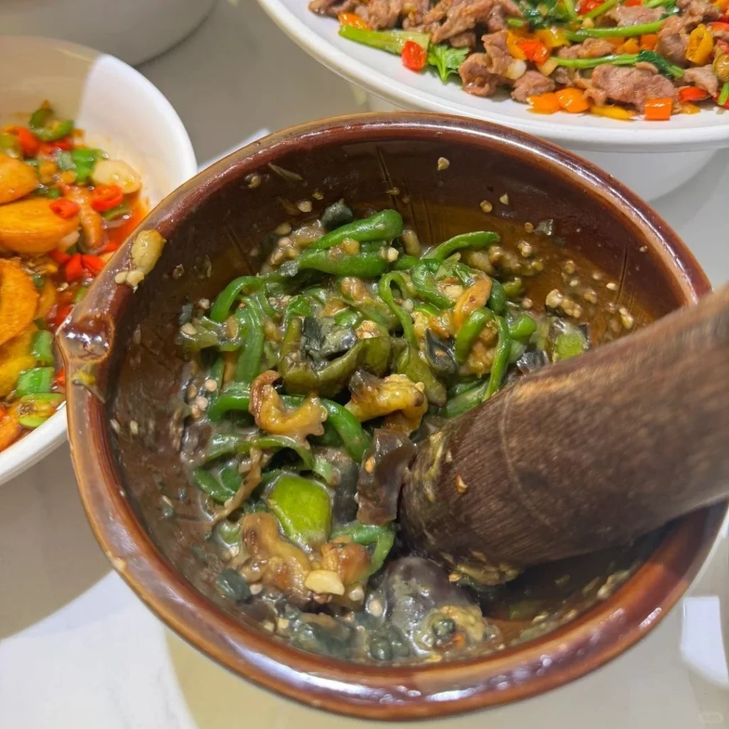 Mashed spicy peppers mixed with century eggs, creating a smoky, rich dish.