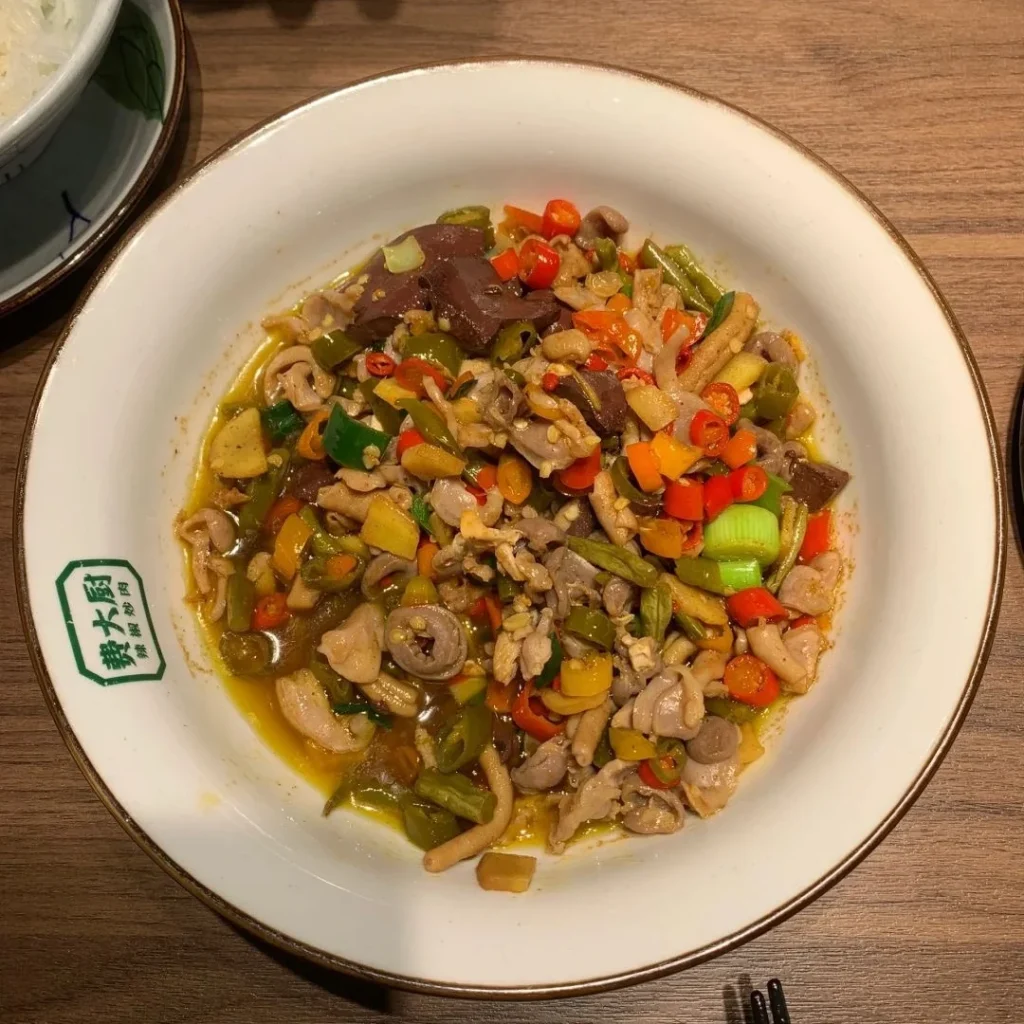 A sour and spicy dish made with tender chicken hearts, livers, and gizzards.