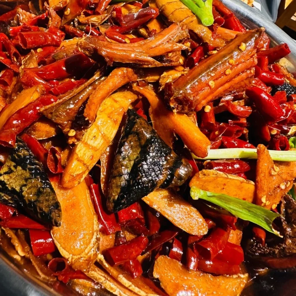 Snake stir-fried with fresh ginger and spicy seasoning, tender and aromatic.