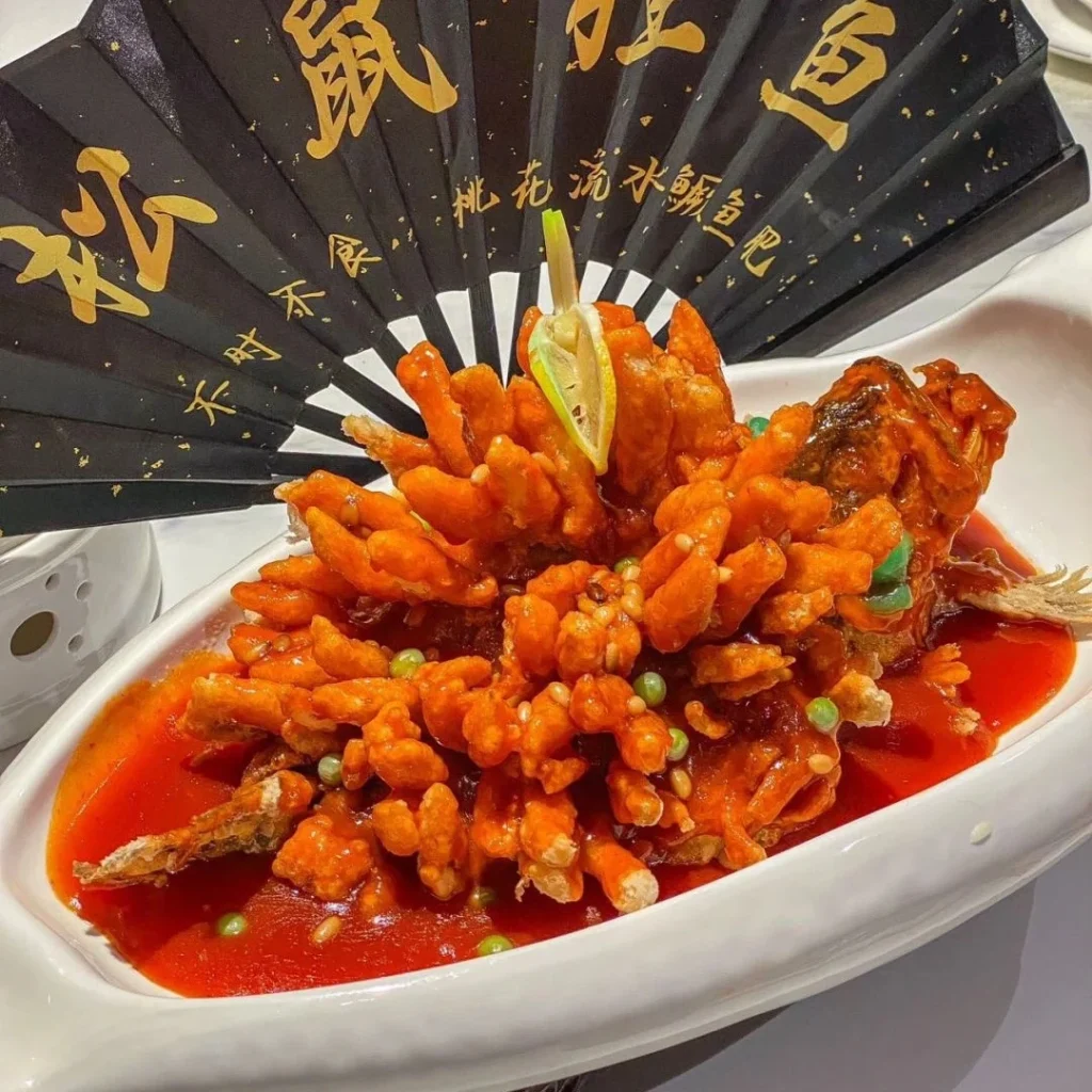 Iconic Suzhou dish, the fish is deep-fried and shaped like a squirrel, served with a sweet and sour glaze.