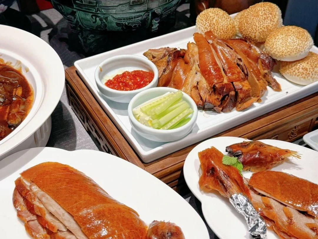 Paired with traditional sauces, fresh vegetables, and either lotus-leaf pancakes or sesame buns, it offers a balanced and delightful dining experience.