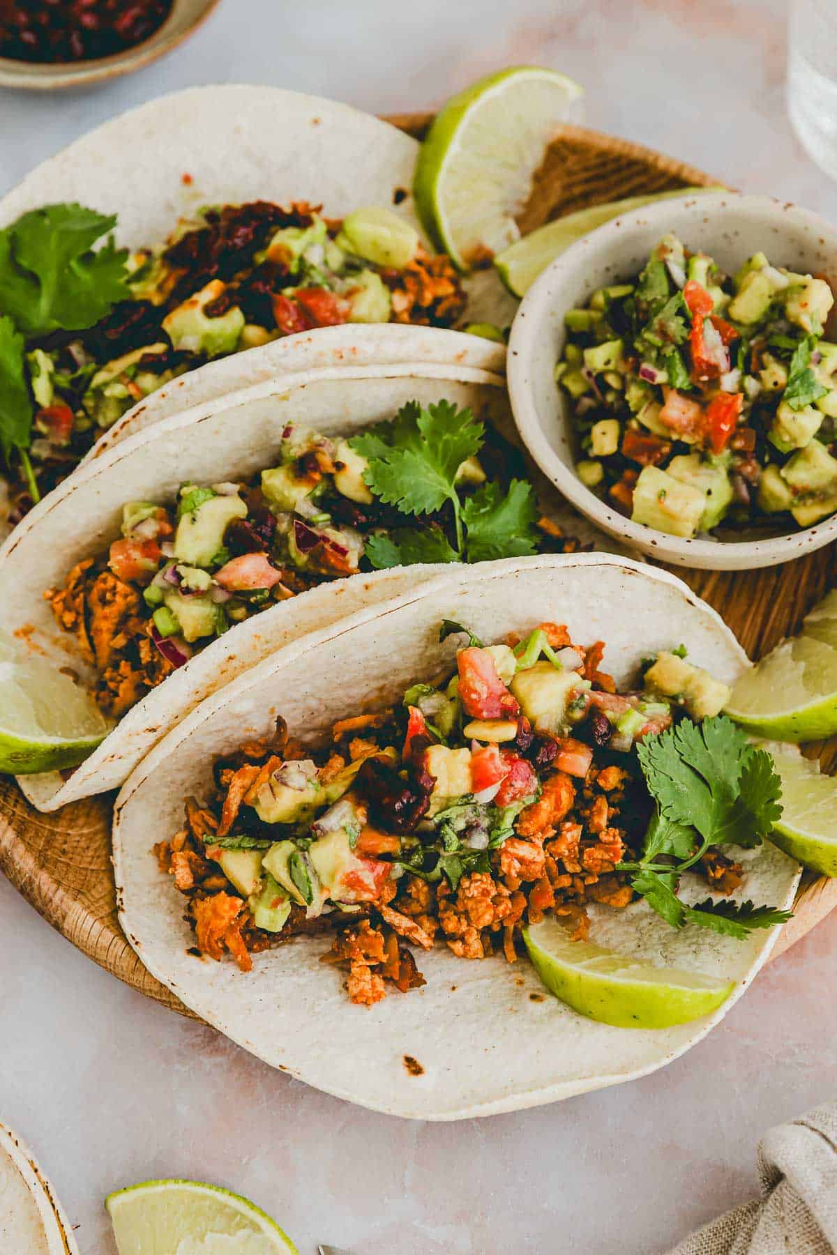 Heat the tortillas in a skillet without oil for 30 seconds each side (or in the microwave), spread with the shredded tofu and top with avocado pico de gallo. Feel free to garnish with chopped cilantro and some more of the adobo sauce.