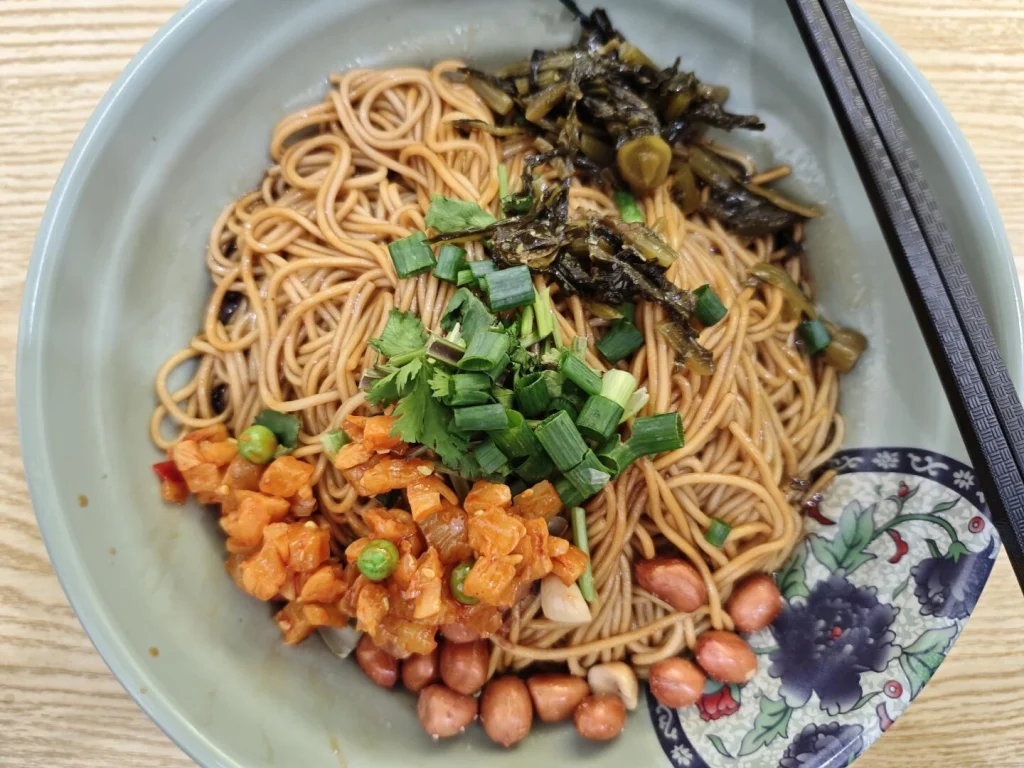 Deceptively simple yet wildly flavorful. Thin noodles are tossed in fragrant scallion oil and soy sauce, sometimes topped with shrimp or shredded pork. At Old Local Noodle Shop (Lao Di Fang), the sauce is simmered from scratch at 4 a.m. daily. Every bite tastes like effort—and hometown pride.