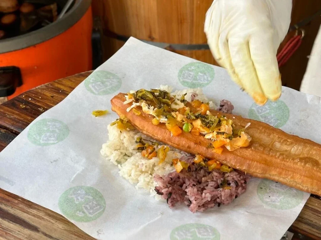 The ultimate grab-and-go breakfast. This chewy rice roll wraps crispy fried dough, pickled mustard greens, and sometimes pork floss into a compact flavor bomb. In Hongkou district, old-school street vendors roll them fresh by hand—soft, savory, and satisfying, especially with a hot soy milk on the side.