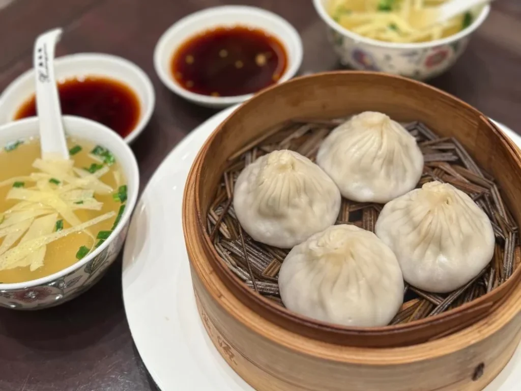Unlike the lightly sweet broth of Shanghai’s xiaolongbao, Wuxi-style soup dumplings are all about deep, layered sweetness and countryside freshness. The pork filling is mixed with soy sauce and sugar, creating a fragrant, naturally sweet soup that bursts from the dumpling with your first bite. The sweetness enhances the umami-rich pork, giving it a melt-in-your-mouth finish that’s anything but greasy. Think of it as Shanghai’s sweeter, bolder cousin.